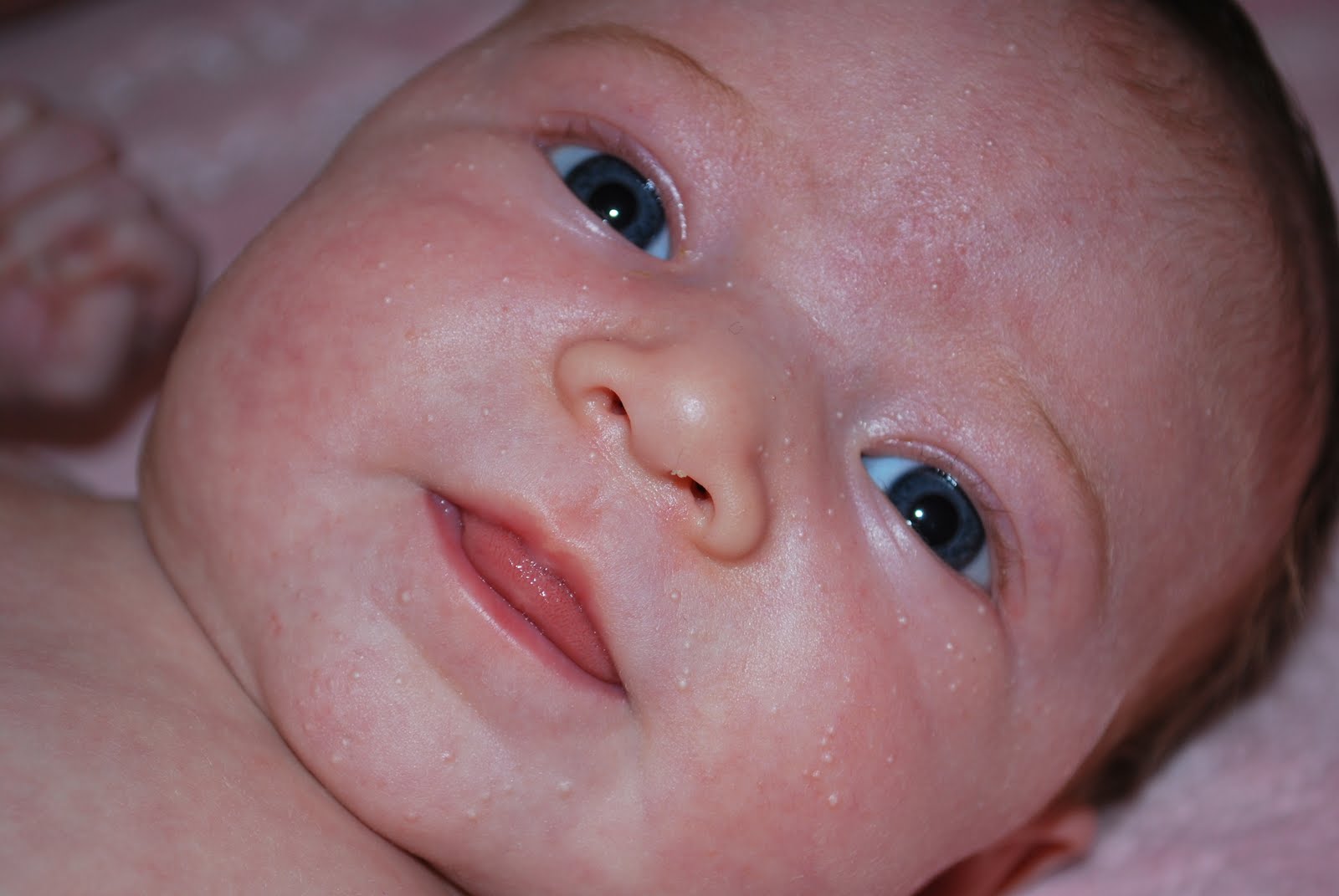 Look at that gorgeous hair! We are beginning to wonder what color it will be. It started off very dark, & it has lightened up considerably. The ends have blonde highlights, but the little baby hairs framing her face & her eyebrows look sort of red/strawberry blonde! We shall see...